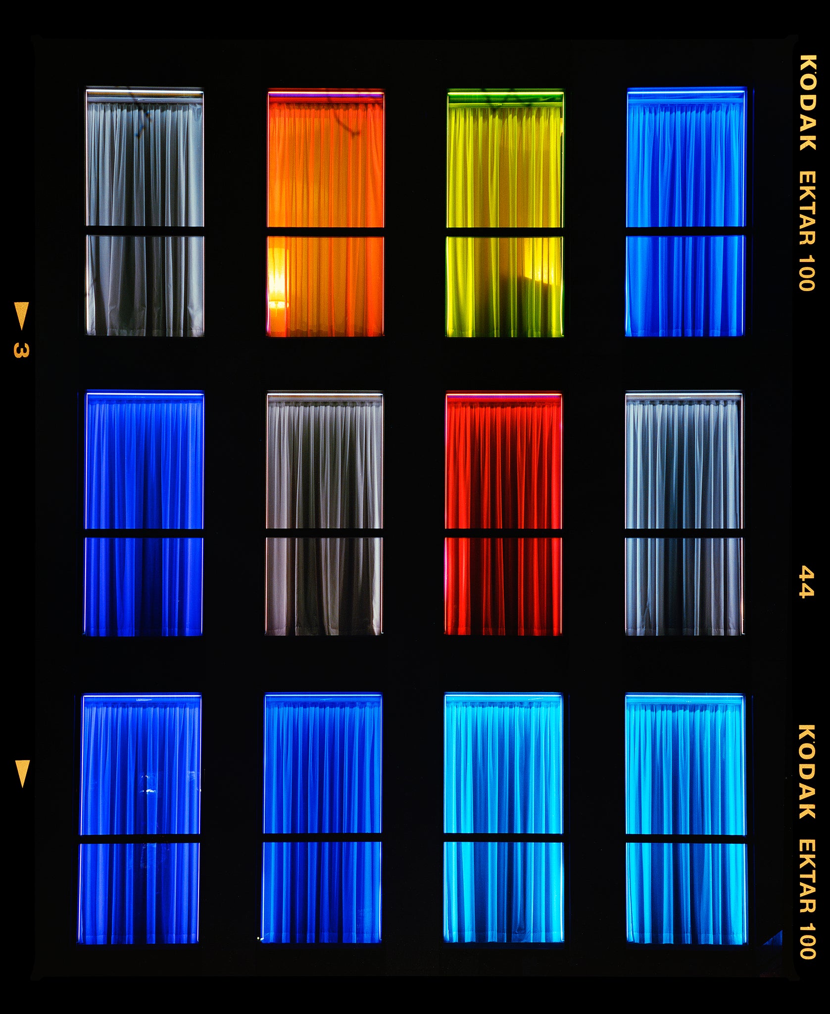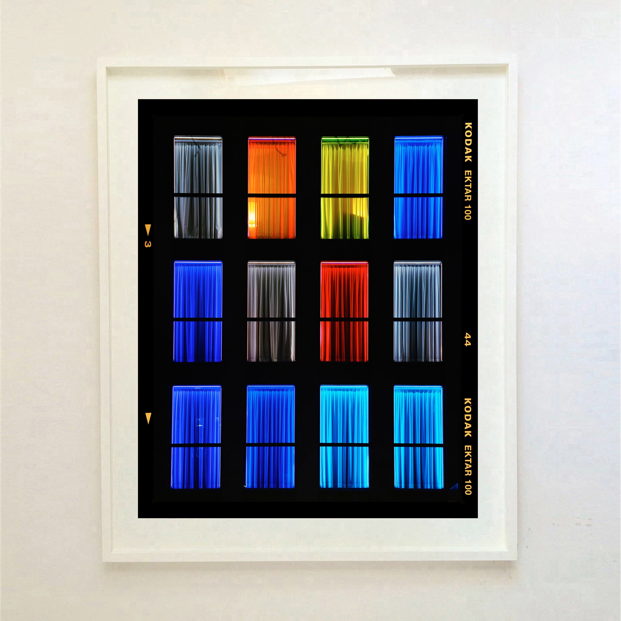 Centric, Italian architecture street photography from Richard Heeps' series, A Short History of Milan. The composition resembles a modern, architectural mosaic, merging minimalism with a raw, emotional spectrum. This artwork stands out for its ability to convey mood and movement through simple yet powerful color contrasts. The uniformity of the window frames juxtaposed with the diverse color palette creates a dynamic visual rhythm, urging viewers to explore each panel individually and as part of the whole.
